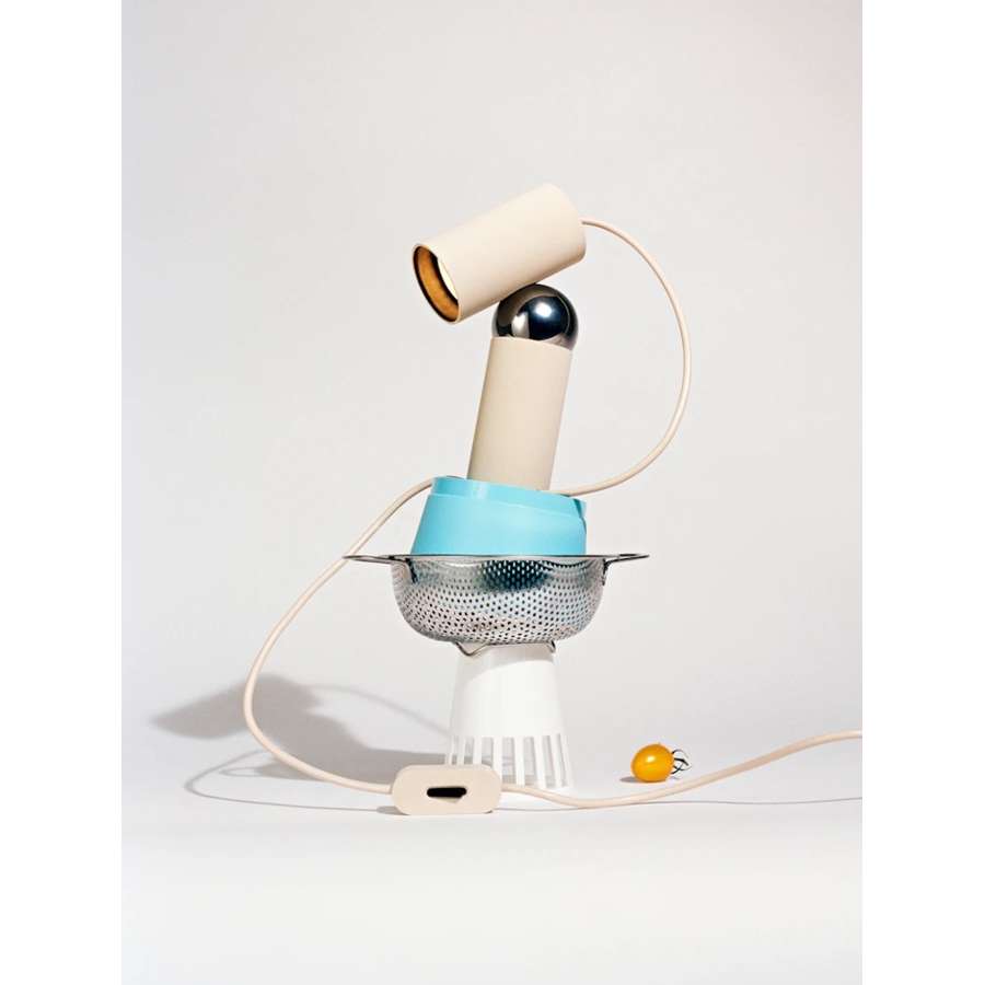 Table lamp with adjustable head. Integrated LED bulb and cut-off providing direct lighting . Body made of a special pigmented polycarbonate deriving from a by-product of paper production rather than from petroleum. Adjustability through steel sphere treated with protective layer deposited in PVD. Useful length of the cable 2 mt. The cable can be adjusted and locked in place through a special slit in the base of the lamp. The product has been designed according to the ISCC standards and it is assembled with total absence of glued components so that it can be completely separated for future recyclability.