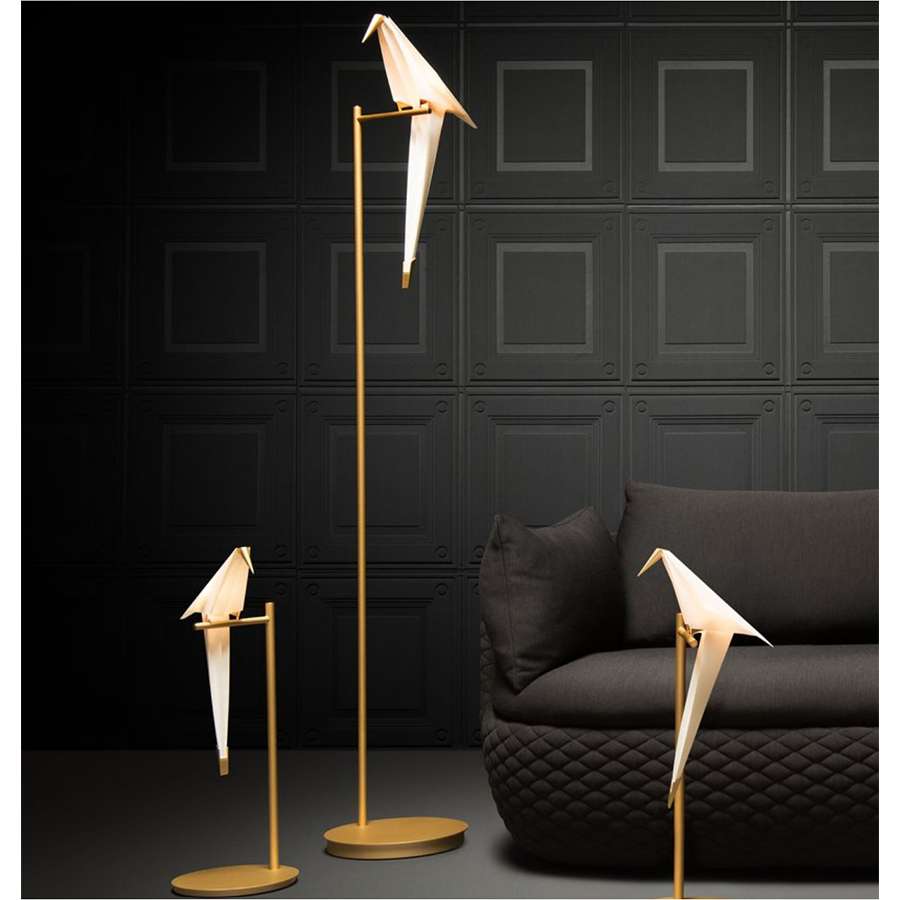 Look up, into the soft light, follow the fluttering sound and sparks of movement. A bird is gracefully balanced on a tall metal perch, beautiful and proud, a swinging glimmer of warm light... yet you are inside, after daylight has faded, under the spell of the Perch Light Floor Lamp!