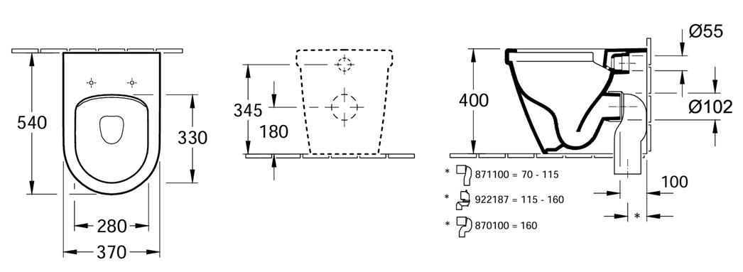 Architectura Floor-standing Toilet Bowl, back to wall, DirectFlush, Oval, horizontal outlet, Size 370 x 540mm