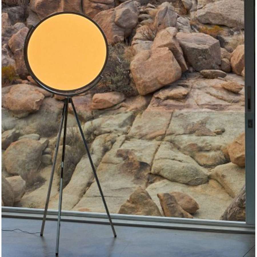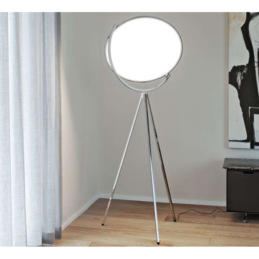 Adjustable floor lamp providing direct light. Painted or chrome-plated aluminium body with metal spinning head, die-cast joints and extruded stem. Silk screened PMMA diffuser. Edge Lighting technology light source. Optical switch sensor placed on the stem that provide Warm Tone dimming function. Power cord length 250 cm. Plug-in power supply with interchangeable plugs.
